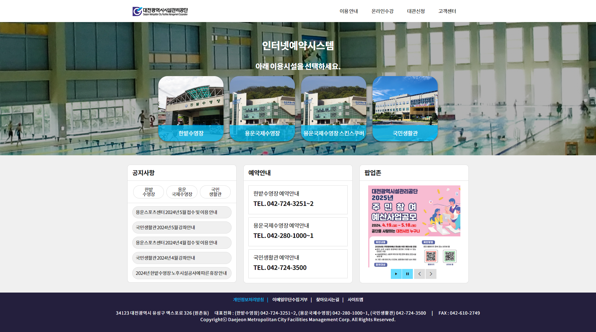 | 적용기술 이용시설 예약, 온라인 수강 신청, 대관 신청, 게시판 기능 개발 (한밭수영장, 용운국제수영장, 국민생활관) |